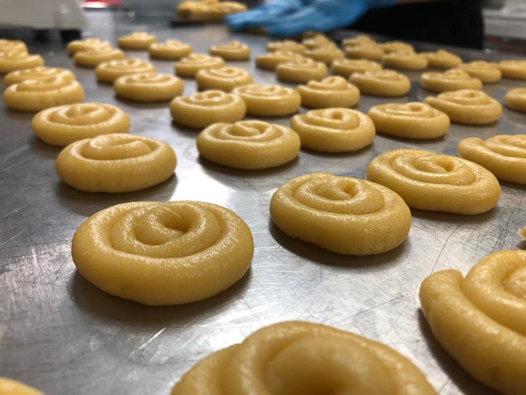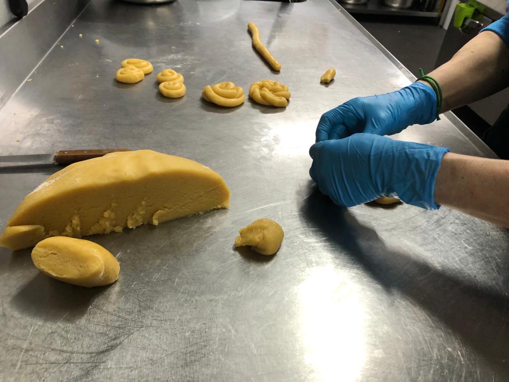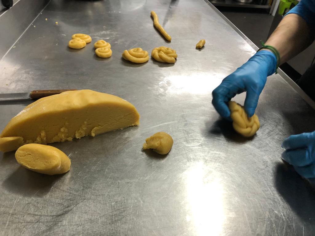 Se termina de amasar el producto en una mesa y se corta la masa en trozos más pequeños